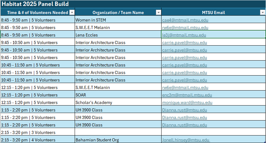 Every volunteer will need to sign the safety form and the MTSU waiver. Please bring it filled out on the day you volunteer. We also have a sign in sheet on the build for every volunteer day. It is very important that you sign in and out in order to document your volunteer hours.